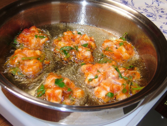 フライパンに油を1cm入れ、IRフライ180℃で熱し、(2)をスプーンで落とし、ふたをし て2分、返して1分でできあがり。