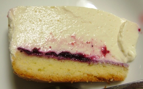 - 内ナベにラップを敷き、スポンジケーキを入れ、ブルーベリージャムを塗る。